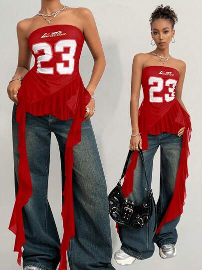 Coolane 青少年女孩 Y2K 图案撞色蕾丝运动抹胸荷叶边迷你裙 - 紅色 - 查看 6