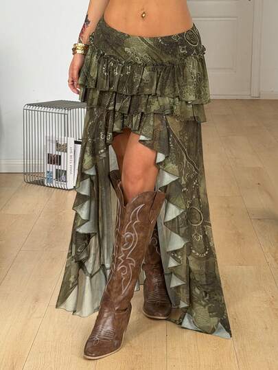 Coolane 女士夏季音乐节嬉皮波西米亚西部风Y2K仙女风网纱白色不规则下摆褶裥半身裙