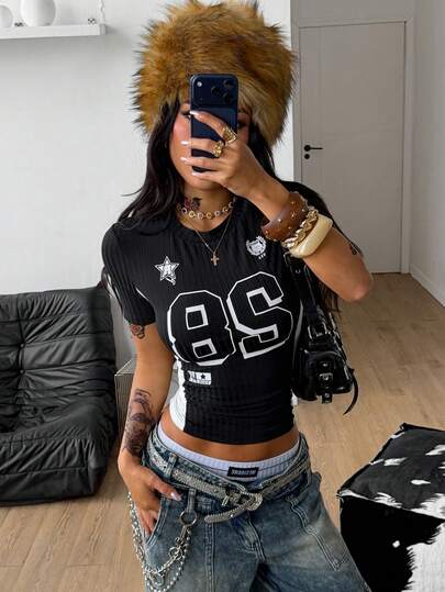 Coolane 女士夏季 Y2K 街头复古音乐会锐舞节外出黑色短款 T 恤 - 黑色 - 查看 1