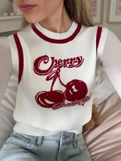 CovetEZ 女款樱桃印花无袖针织上衣 - 紅白色 - 查看 4