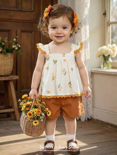 Cozy Pixies 2件套女婴碎花荷叶边无袖上衣和松紧腰裤套装 - 彩色 - 查看 1