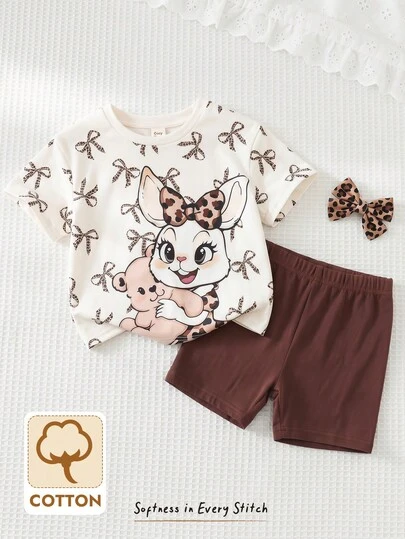Cozy Pixies 女婴卡通图案针织柔软圆领短袖上衣和松紧腰短裤两件套