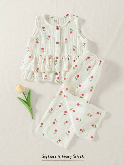 Cozy Pixies 女宝宝夏季休闲碎花无袖荷叶边下摆衬衫和宽松阔腿裤套装 - 白色 - 查看 1