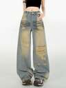 青少年女孩宽松直筒破洞牛仔裤,复古美式洗水牛仔裤