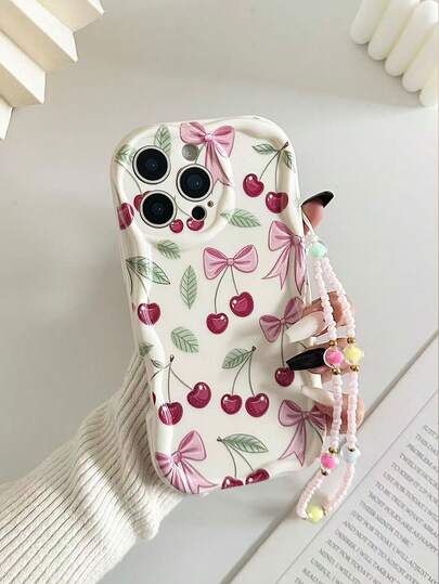 6. 奶油色波浪边亮面樱桃彩绘防摔手机壳,配串珠手链配件,兼容 17pro/17Air/17/17promax/16/11/16pro/16plus/16promax/16e/15Promax/13/14/12/XS/XR/7G/8P、Galaxy 等机型。