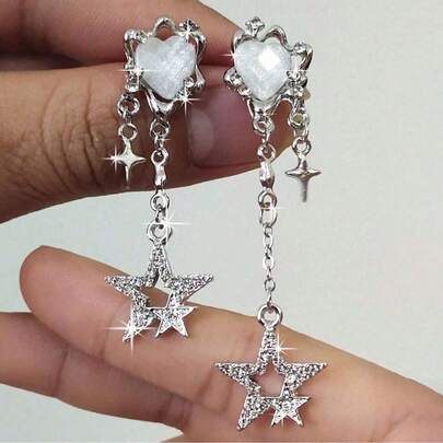 创意复古设计感女式裂纹链Y2K心形钻石星星大小星星耳环甜美酷女孩流苏耳钉