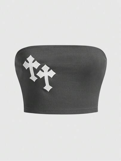 ROMWE Goth 交叉印花抹胸上衣 - 灰色 - 查看 1