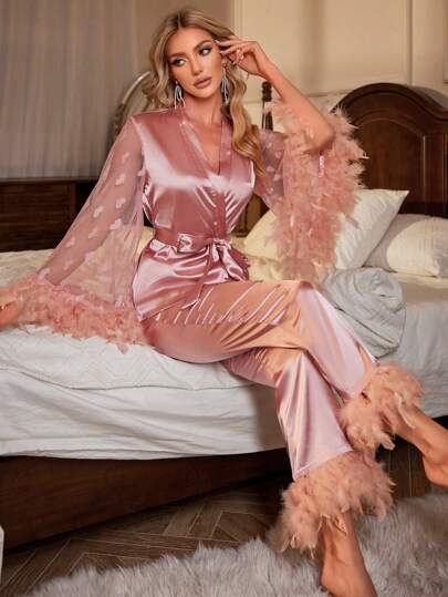 Crystal Vow 毛边腰带缎面睡衣套装/家居服套装,秋冬服装 - 粉色 - 查看 1