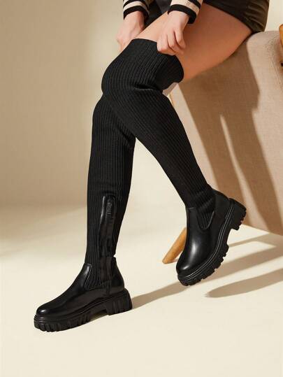 CUCCOO BASICS 女士鞋子简约拼接设计针织黑色过膝袜靴夏季度假鞋夏季促销返校鞋大学生鞋圣诞节和新年假期 - 黑色 - 查看 1