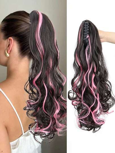 卷发马尾接发,深棕色,爪夹式接发,20英寸波浪马尾假发,合成自然蓬松假发,日常假日使用 - 彩色 - 查看 1