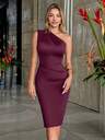 CurvySweet 经典优雅不对称露肩前开衩垂褶缎面腰带修身中长连衣裙,适合日常通勤、商务休闲、晚宴、派对、假日、度假等场合。