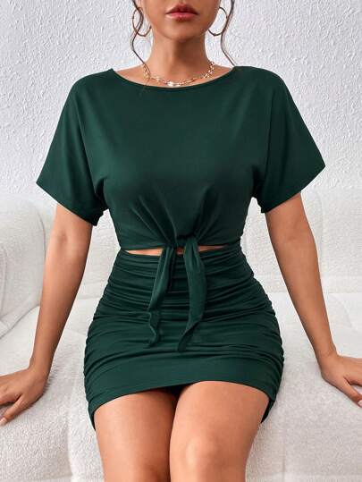 INAWLY Solva 鏤空前打結褶邊蝙蝠袖洋裝 - 墨綠色 - 查看 1