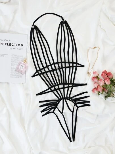 鏤空背帶連身背心 - 黑色 - 查看 1