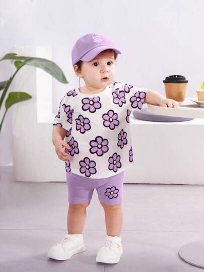 SHEIN 可愛編織卡通花紋鬆身短袖T恤與彈性腰短褲套裝,適合女嬰夏季 - 淡紫色 - 查看 1