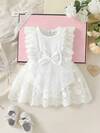 女婴甜美公主风白色蕾丝连衣裙,饰有蝴蝶结,网纱裙摆设计,适合日常外出、休闲旅行、家庭聚会、生日派对、儿童节等场合穿着