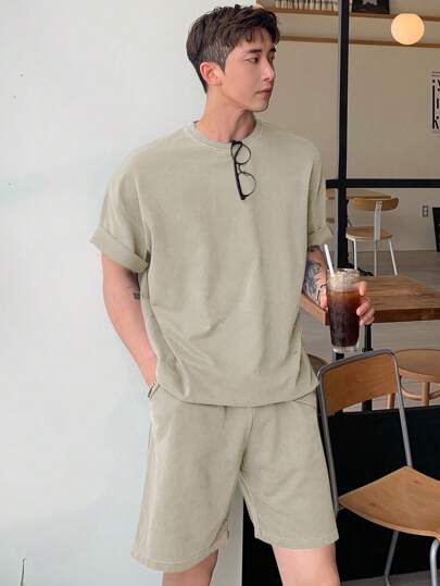 DAZY 2 件套男士纯米色 T 恤和短裤,夏季舒适服装 - 米色 - 查看 1