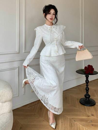 DAZY 优雅白色蕾丝缎带系腰披肩领上衣和半裙两件套,适合情人节、婚礼等场合。 - 米色 - 查看 6