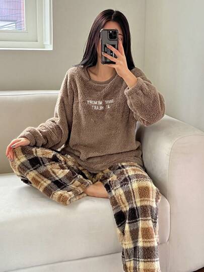 DAZY 法兰绒加厚字母刺绣上衣和格子裤蓬松睡衣套装,秋冬舒适保暖装 - 棕色 - 查看 1