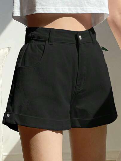 DAZY 高腰卷邊牛仔短褲 - 黑色 - 查看 1