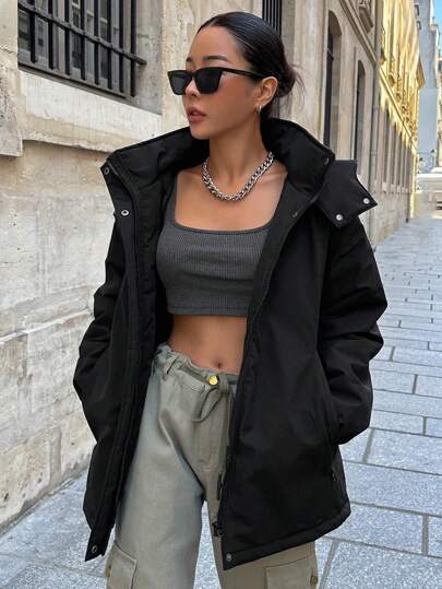 DAZY 字母图案拉链按扣连帽冬季厚口袋外套,冬季女装,冬季外套女式夹克 - 黑色 - 查看 8