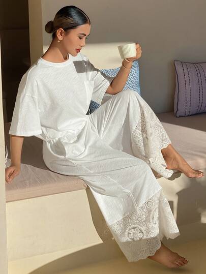 DAZY 宽松T恤上衣搭配阔腿七分裤睡衣套装,刺绣拼接设计,女士款 - 白色 - 查看 1