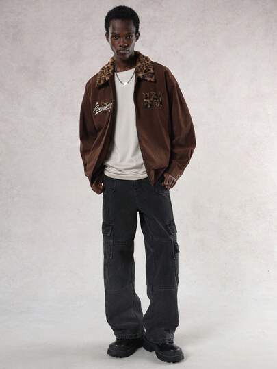 DAZY 男士棕色拼接撞色领字母刺绣夹克外套,秋季款 - 鏽棕色 - 查看 5