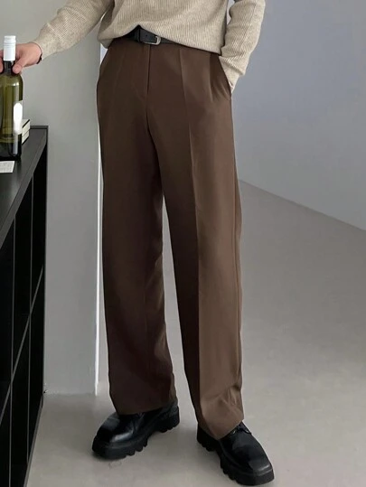 SHEIN X Scheana DAZY 男士休闲纯色斜插口袋直筒西装裤,秋季商务装 - 棕色 - 查看 1