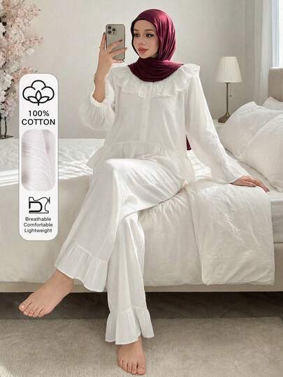 DAZY 浪漫轻盈纹理面料荷叶边女士睡衣套装 - 白色 - 查看 1