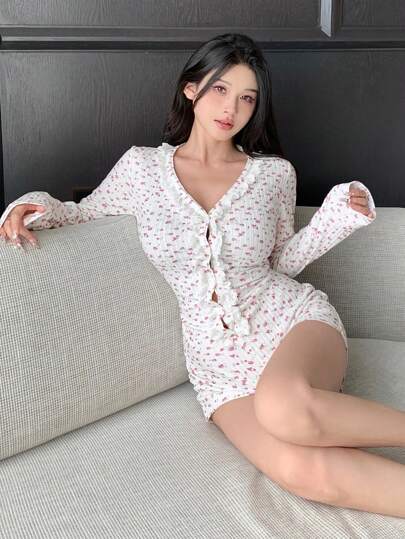 DAZY 荷叶边花卉印花长袖休闲连体睡衣 - 白色 - 查看 9