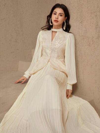 DAZY SHEIN X Hannahelzahed 女士奶油黄色蕾丝刺绣衬衫和裙子两件套沙滩装,夏季 - 米色 - 查看 1