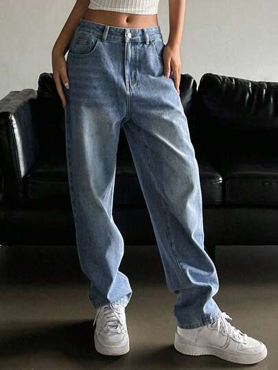 DAZY 斜口直腳牛仔褲 - 中等水洗藍 - 查看 1