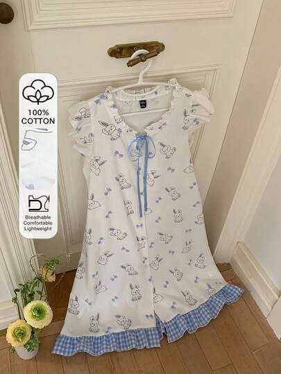 DAZY 甜美兔子印花格子荷叶边宽松女士夏季睡裙 - 白色 - 查看 1