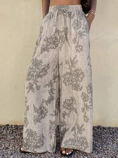 DAZY 女士休闲碎花阔腿裤,春季 - 灰色 - 查看 6