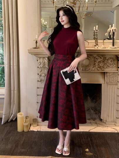 DAZY 女士优雅高领无袖上衣和A字印花半裙两件套,夏季婚礼宾客礼服 - 酒紅色 - 查看 1
