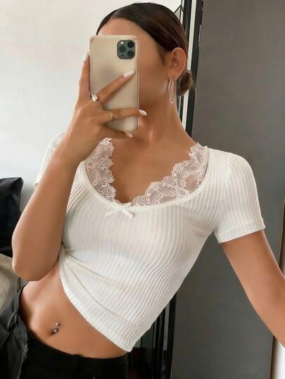 DAZY 女士蕾丝拼接性感修身长袖T恤