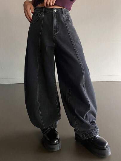 DAZY 女士宽松拼接牛仔喇叭牛仔裤,休闲街头风,春夏款 - 灰色 - 查看 1