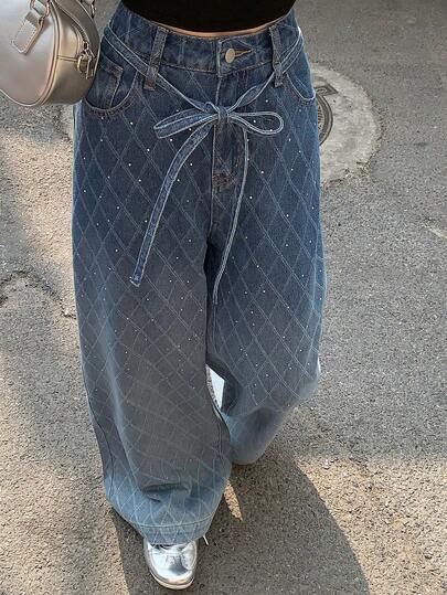 DAZY 女士格子水钻做旧系带休闲牛仔裤 - 藍色 - 查看 1