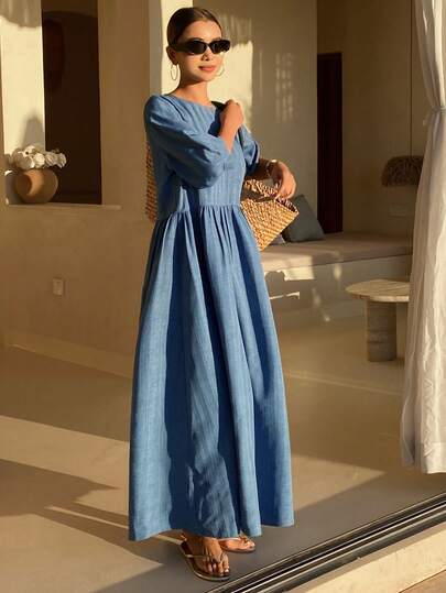 DAZY 女士褶裥休闲收腰中长连衣裙,适合度假和派对穿着 - 藍色 - 查看 1