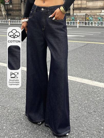 DAZY 女士宽松直筒水洗原色牛仔裤 Y2k - 藍色 - 查看 10