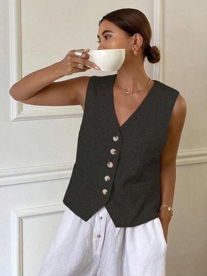 DAZY 女士纯色修身V领无袖亚麻西装外套,秋季商务装 - 深灰色 - 查看 1