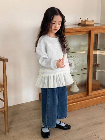 DAZY 女童圆领针织抓绒撞色网眼卫衣,秋季款 - 灰色 - 查看 1