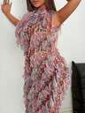 复古风格女式网眼圆领撞色宽松腰长袖印花连衣裙,秋季新品