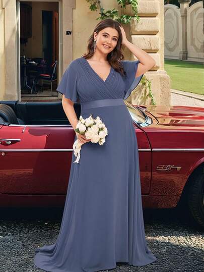 大码优雅V领褶皱胸部蓝色伴娘礼服,婚礼宾客正式礼服 - 藍色 - 查看 1