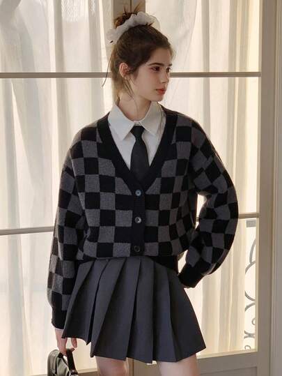 Dazy Kids 少女格纹落肩长袖休闲宽松针织开衫,秋冬 - 灰色 - 查看 1