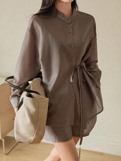Dazy-Less 女士休闲系带前开襟衬衫和短裤两件套,秋季款 - 灰色 - 查看 5