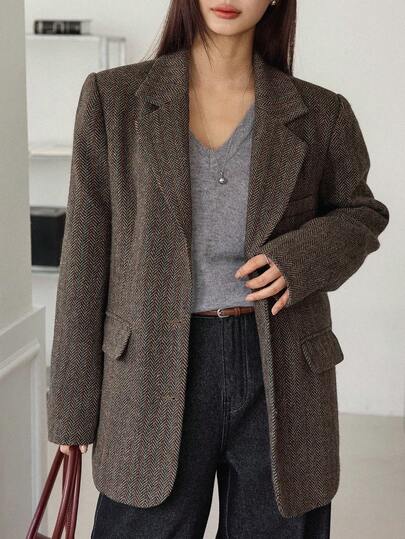 Dazy-Less 女士宽松商务休闲格子针织加厚外套,秋冬季优雅时尚 - 棕色 - 查看 7