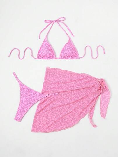 小花三角比基尼套裝搭配沙灘泳裝遮陽裙 - 粉色 - 查看 1