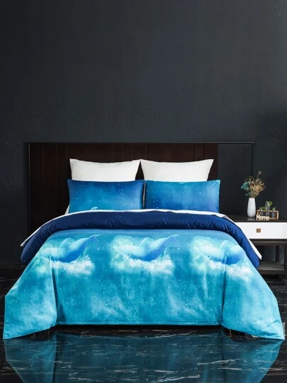 海豚圖案被套套裝不附帶內芯 - 藍色 - 查看 1