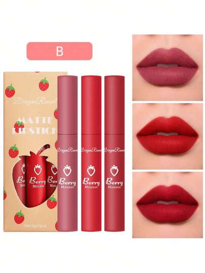 Dragon Ranee 3入組草莓啞光唇彩成套工具,持久絲絨不粘杯子可愛口紅 - 彩色 - 查看 1