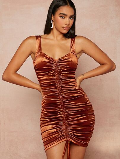 抽繩褶邊絲絨緊身洋裝 - 亮橙色 - 查看 1